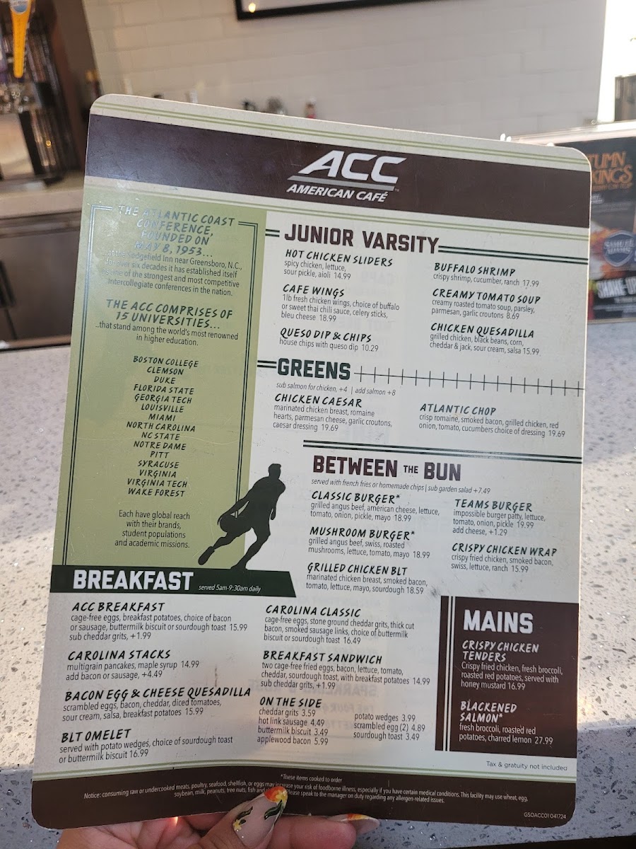 Introducing ACC American Café, situated conveniently at 2400 John Brantley Blvd, Morrisville, NC, this café makes waiting for your flight a delightful experience. The menu offers a vibrant selection of dishes, from the comforting Boston Style Clam Chowder to the refreshing Power Salad. For those craving savory flavors, the shrimp po’ boy and mushroom burger have received rave reviews, showcasing the café's dedication to quality.